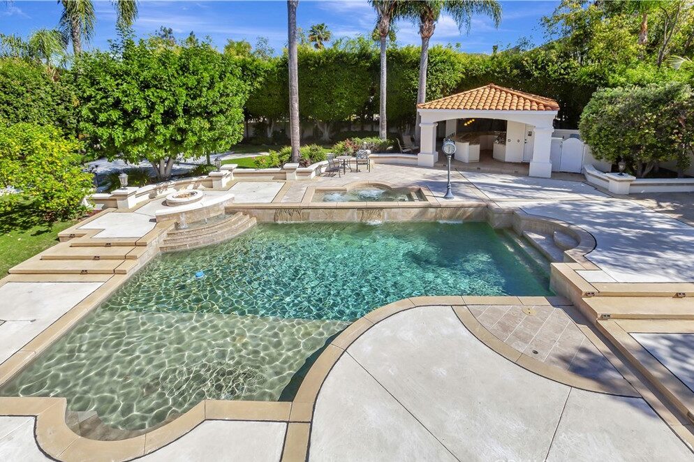 Outside, the property transforms into a true backyard oasis. The resort-style setting includes a sparkling pool and spa, sport court, outdoor kitchen, and a pool house complete with wet bar and full bath. Whether hosting lively gatherings or enjoying quiet evenings under the stars, the outdoor spaces offer endless opportunities to relax and entertain.