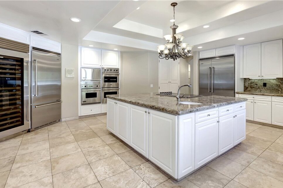 At the heart of the home, the expansive kitchen was designed for both chefs and entertainers. Outfitted with two refrigerator-freezers, a large Sub-Zero wine cooler, three Viking ovens, a six-burner range, and warming drawers, the space offers exceptional functionality while maintaining a welcoming atmosphere. Direct access to the outdoor entertaining areas makes it easy to transition from indoor dining to relaxed poolside meals.