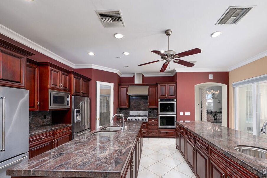 At the heart of the home is an enormous kitchen featuring two preparation and serving islands, granite countertops, stainless steel appliances with gas cooking, and a walk-in pantry. Open to the dining area and living room, this space is designed for connection and entertaining, anchored by a striking one-of-a-kind stone fireplace and French doors that open directly to the outdoor living areas.
