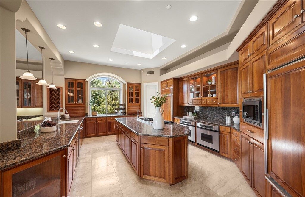 Step into a dramatic foyer where soaring ceilings, walls of glass, and natural light set the tone for the rest of the home. The open-concept floor plan flows effortlessly from the formal living and dining rooms into a chef’s kitchen and spacious family room—perfect for both entertaining and everyday living. Finishes include stone flooring, rich quartz and granite countertops, built-ins, and designer lighting throughout.