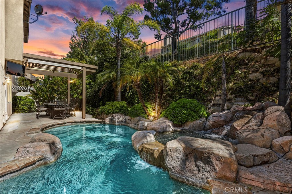 Outdoors, the fully usable backyard offers year-round enjoyment with a heated pool and spa accented by natural rock, a new vinyl privacy fence, and a covered patio for al fresco dining or relaxing in the shade.
