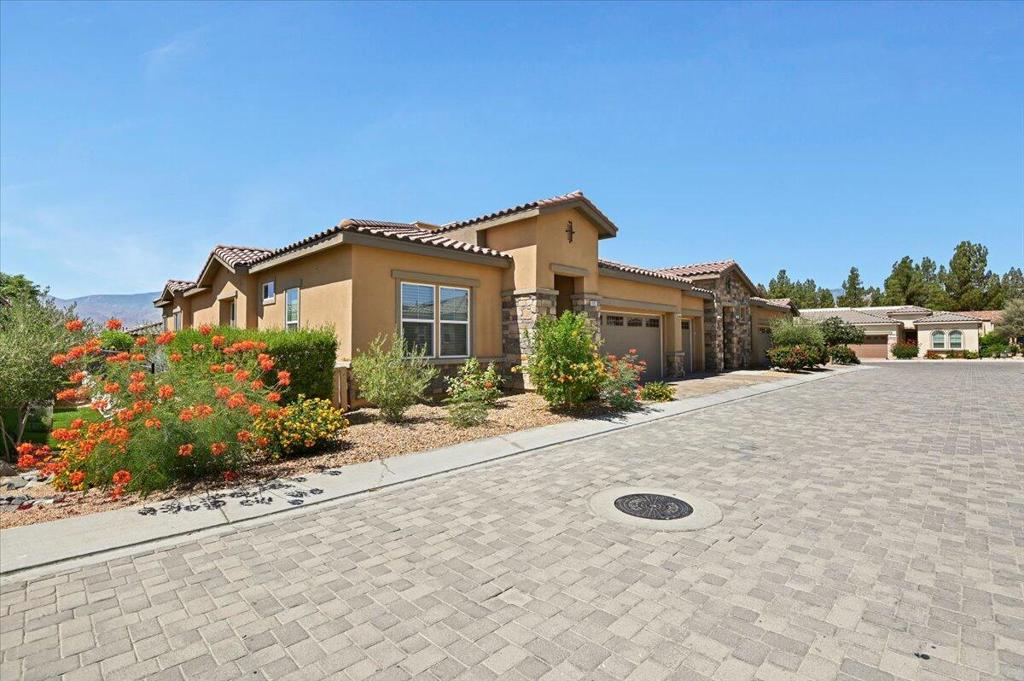 Come check me out…I’m gorgeous inside. Count the upgrades including crown molding in both bedrooms along with wainscoting in the Master, wood herringbone on wall of den, Hunter Douglas motorized window treatments, porcelain tile, epoxy garage floor and built-in cabinetry. You just don’t get all that with new construction without paying a pretty penny. More importantly, OWNED SOLAR and tankless water heater makes for an energy efficient home that even has it’s own spa. An 80” TV with sound system is a BONUS. Villa Portofino is a 55+ community with a beautiful club house, pool and spa and so many amenities. Location is close to shopping and Eisenhower hospital. HOA includes Cable TV, internet, water, gas, trash, window washing 2 X’s year, landscape, building insurance, roof and exterior maintenance. So you see, this is an awesome home waiting for it’s new owner. Call today for your personal tour.
