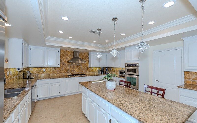 The formal dining room sets an elegant tone with its coffered ceiling, while the gourmet kitchen serves as the heart of the home. Designed for both everyday living and entertaining, it features granite countertops, a center island with pendant lighting, double ovens, a five-burner gas range, a stainless steel built-in refrigerator, and a walk-in pantry. The adjoining breakfast nook overlooks the serene backyard, offering a perfect space to enjoy morning coffee or casual meals.