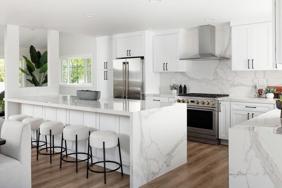The heart of the home is the chef’s kitchen, centered around a dramatic 12-foot porcelain waterfall island. Outfitted with Monogram professional appliances, a built-in wine refrigerator, and a hydraulic flip-up pass-through window, it is designed for both connection and function. Dining spaces abound—offering capacity for over 20 guests, equally suited for intimate gatherings or lively celebrations.